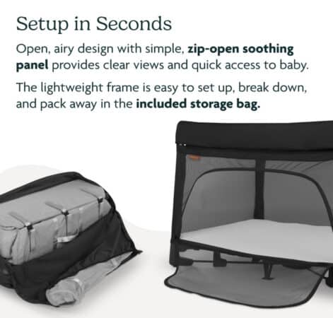 The Remi is a safe, breathable, easy-to-use playard. It’s an all-in-one sleep and play solution that works from birth through toddlerhood. It functions as a bedside bassinet, travel crib, and portable playard. Use the included mesh bassinet for newborn sleep, then remove it for playtime or travel. We have this one for baby’s visits and it’s really handy.