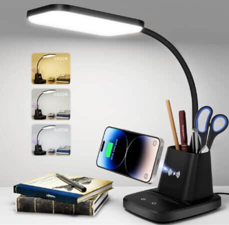 This is a well-priced compact desk lamp with a built-in phone charger and attached pencil cup. Dimmable (which is considerate to a roommate who might be trying to sleep) and has a flexible neck. Save 40%