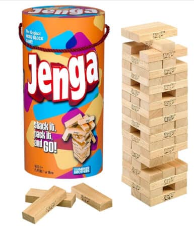 A classic family-friendly wood block stacking game, Jenga challenges one or more players ages 6+ to pull and re-stack blocks without toppling the tower, includes 54 blocks and a handy tube-shaped storage box, and makes a simple, fun choice for parties or gifts.