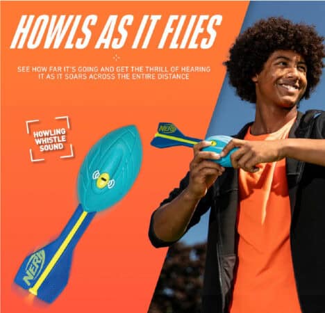 The NERF Neon Vortex Aero Howler is a soft foam football designed for long-distance, whistling throws, featuring a 3-finned tail for tight spirals, an easy-grip design for all ages, and durable construction for indoor or outdoor play.